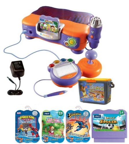 V Smile TV Learning System Plus with 9V Adapter, Storage Tub, and 4 Extra Games. Includes V Smile Games Spiderman - Doc Ock's Challenge, Little Red Riding Hood, Superman, and Soccer Challenge Age Group: 3-6 Years This V Smile TV Learning System Bundle includes 4 extra V Smile Game Cartridges valued at 79.80. When you order this bundle you get these 4 extra games: Spiderman - Doc Ock's Challenge, Little Red Riding Hood, Superman, Soccer Challenge. These normally sell for .95 each. In addition to the great savings on these games, this bundle comes also includes a 9V adapter to help save on batteries, and a colorful storage tub to hold all of your V Smile Games and accessories! Limited quantity available so order today!